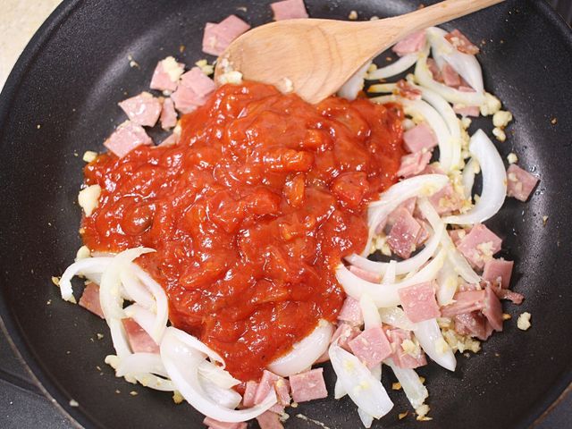 토마토소소를 넣고 골고루 섞어가며 볶아주세요.