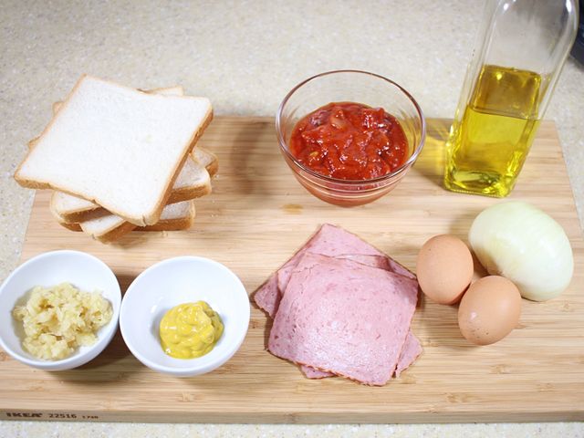 다진마늘, 슬라이스햄, 머스타드소스 준비했어요.