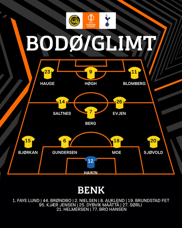 노르웨이 원정을 떠난 토트넘도 4-3-3 전형을 꺼냈다. 굴리엘모 비카리오가 골문을 지켰고, 데스티니 우도기, 미키 판더펜, 크리스티안 로메로, 페드로 포로가 수비라인에서 호흡을 맞췄다. 로드리고 벤탄쿠르와 이브 비수마, 그리고 데얀 쿨루세브스키가 중원을 맡았다. 히샬리송과 도미닉 솔란케, 브레넌 존슨이 스리톱을 구축해 토트넘의 공격을 이끌었다.