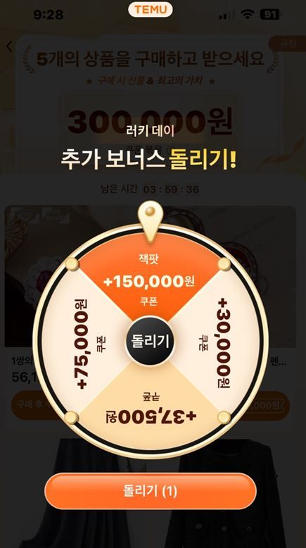 ‘스핀하여 당첨, 30만원 받기’. 8일 테무 앱에 접속하자 화면 가득 룰렛이 떠올랐다. 쉼 없이 돌던 룰렛이 30만원 칸에 천천히 멈춰 섰다. ‘축하합니다! 잭팟을 터트렸어요’ 문구와 함께 순식간에 30만원 상당의 쿠폰 묶음이 내려졌다. 테무에서 5개 상품을 구매하면, 결재액으로 사용할 수 있다는 안내가 뒤따랐다.