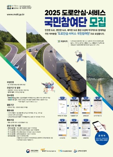 [경기연합신문 ] 국토교통부는 전국 도로의 안전 수준을 높이고, 국민이 직접 참여하는 체감형 정책 수립을 위해 관계기관 합동으로 5월 9일부터 ‘2025 도로안심ㆍ서비스 국민참여단’을 모집한다.