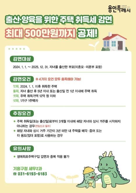 [와이뉴스] 용인특례시 기흥구는 출산·양육 가구의 주택 취득세 감면 제도를 시민들에게 널리 알리기 위해 5월부터 집중 홍보에 나선다고 9일 밝혔다.