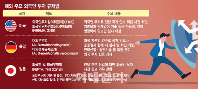 독일과 일본도 국가 안보 차원에서 외국 자본의 기술 인수를 엄격히 통제하고 있다. 독일은 2020년 ‘대외무역법’을 개정해 안보나 공공질서에 영향을 미칠 수 있는 외국인 투자에 대해 정부가 자유롭게 심사하고 제한할 수 있도록 했다. 일본도 2021년 ‘국가안보 및 투자법’을 개정하면서 외국 자본의 투자 신고 대상 분야를 기존 6개에서 17개로 확대하고, 25% 이상 지분을 확보하는 경우 사전 신고를 의무화했다. 또 위험이 인지될 경우 강제로 심사를 개시할 수 있는 ‘콜인(Call-in)’ 권한도 확보했다.