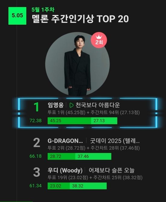 최근 멜론차트에 따르면, 임영웅의 '천국보다 아름다운'이 5월 1주 차 멜론 주간 인기상 TOP20 1위에 올랐다.