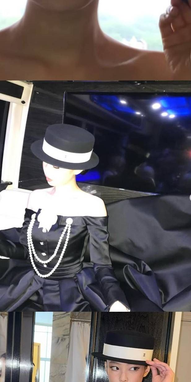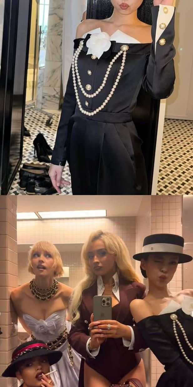 제니는 클래식한 매력을 드러내면서도 슈트를 입은 채 포인트를 줬다. 블랙 정장 팬츠와 오프숄더 블랙 새틴 점프수트를 매치, 해당 의상은 샤넬 장인들이 330시간 이상 공을 들여 제작한 것으로 전해졌다.