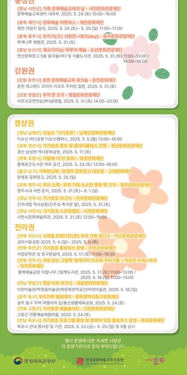 또한, ▲서울 광진문화재단은 서울어린이대공원 열린무대에서 ‘가족 문화예술교육 원데이클래스 체험존’을, ▲전남 영암문화관광재단은 문화예술 향유 기회가 적은 가족을 위한 영암 내 미술관 및 도예공방 투어 프로그램인 ‘영암 아트피크닉’을 펼친다. ▲부산 금정문화재단은 지역 명소인 금정산성에서 가족과 함께 역사 연계 문화예술 체험 ‘손잡고 걷는 시간여행’을 개최한다.
