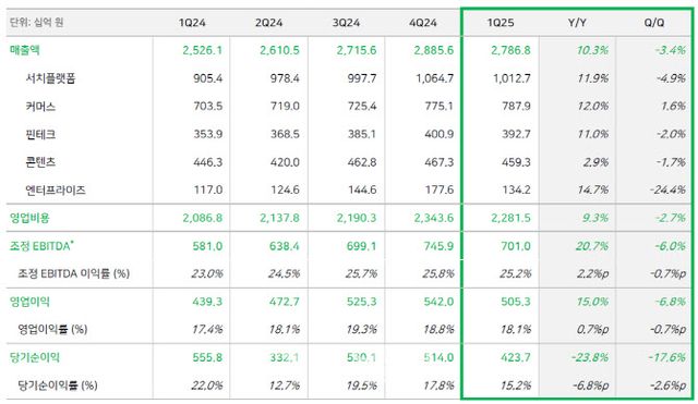 서치플랫폼은 상품 개선 및 타겟팅 고도화 등의 영향으로 전년 동기 대비 11.9% 증가했는데 AI를 활용한 지면 최적화가 진행되며 상품 경계가 허물어짐에 따라 전체 광고 효율 및 매출 성장이 이어지는 중으로, 2분기부터는 전체 네이버 플랫폼 광고 중심으로 공개할 계획이다.