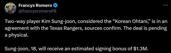 로메로 기자는 "'한국의 오타니'로 불리는 투웨이 플레이어 김성준이 텍사스 레인저스와 계약을 체결했다고 확인했다. 현재 신체검사 절차를 기다리는 상태"라며 "이 18세 한국인 선수는 약 130만 달러(한화 약 18억원) 계약금을 받을 것으로 추정된다"라고 주장했다.
