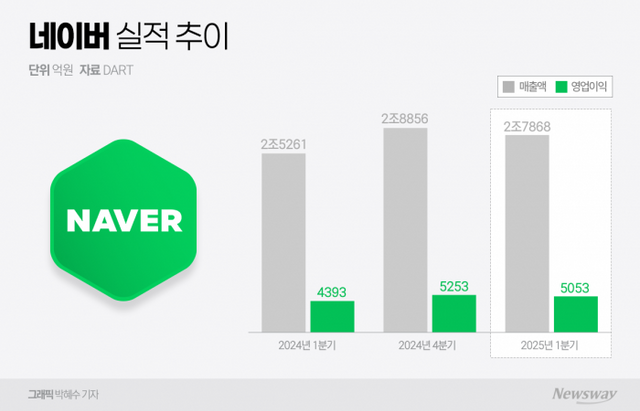 네이버는 9일 올해 1분기 매출 2조7868억원, 영업이익 5053억원을 기록했다고 공시했다. 이는 전년 동기와 비교해 각각 10.3%, 15% 늘어난 수준이다. 사업 부문별로 보면 ▲핀테크는 3927억원 ▲콘텐츠는 4593억원 ▲엔터프라이즈는 1342억원의 매출을 냈다.