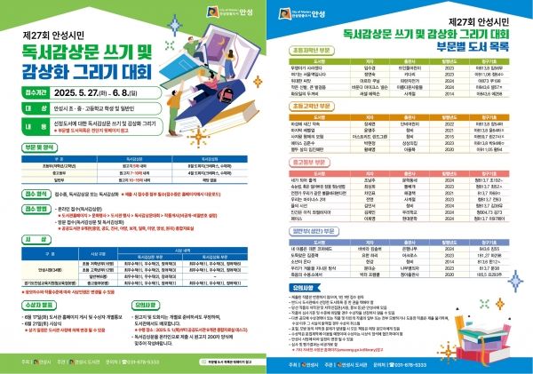 안성시는 지역민의 독서문화 확산을 위해 ‘제27회 안성시민 독서감상문 쓰기 및 감상화 그리기 대회’를 개최한다고 밝혔다. 올해로 27회를 맞이하는 이번 대회는 독서인구 저변 확대와 책 읽는 분위기 조성을 목표로, 지난 1999년부터 매년 열리고 있는 안성시의 대표 독서문화행사다.