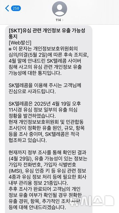 문자에서 SK텔레콤은 “4월 19일 오후 11시경 유심 정보 일부의 유출 의심 정황을 발견했고 개인정보보호위원회 및 민관합동조사단이 정확한 유출 원인, 규모, 항목 등을 조사 중이며, SK텔레콤은 적극 협조하고 있다”고 했다.