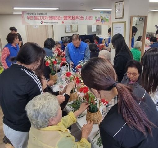 이번 활동에는 백석중학교 학생들이 직접 참여해 경로당과 마을회관을 찾아 어르신들과 함께 카네이션 꽃바구니를 만드는 시간을 가졌다.