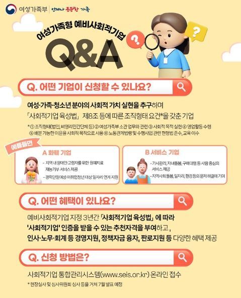 여성·가족·청소년 분야의 사회적 가치 실현을 추구하며 「사회적기업 육성법」 제8조 등에 따른 조직형태 요건을 갖춘 기업.