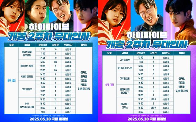 이어 6일(금) 현충일과 7일(토)에도 이재인, 안재홍, 김희원, 박진영, 강형철 감독이 무대인사에 나선다. 금요일에는 롯데시네마 청량리, CGV 왕십리, 롯데시네마 건대입구, 롯데시네마 월드타워, 메가박스 코엑스에서, 토요일에는 롯데시네마 김포공항, 메가박스 목동, 씨네Q 신도림, CGV 영등포, CGV 용산아이파크몰에 출격해 관객들과 특별한 만남을 이어간다.
