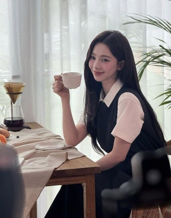 사진 속 카리나는 흰색 반팔 카라 셔츠와 검은색 조끼를 입고 청순한 매력을 발산했다.