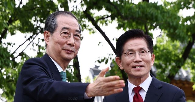 김문수 국민의힘 대통령 후보와 한덕수 무소속 대선 예비후보가 지난 8일 오후 서울 여의도 국회 강변서재에서 열린 '후보 단일화' 회동에서 인사를 나누고 있다. / 뉴스1