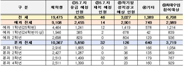 또 자퇴 및 제적 등으로 발생한 결손인원은 각 대학이 편입학을 통해 인원을 충원할 수 있도록 지원하고 유급 결정으로 향후 동일 학년에 복수학번의 학생들이 동시에 교육받아야 하는 상황에 대비해서는 각 대학이 진급시기별 학생현황을 면밀히 분석해 준비할 수 있도록 하겠다고 밝혔다.
