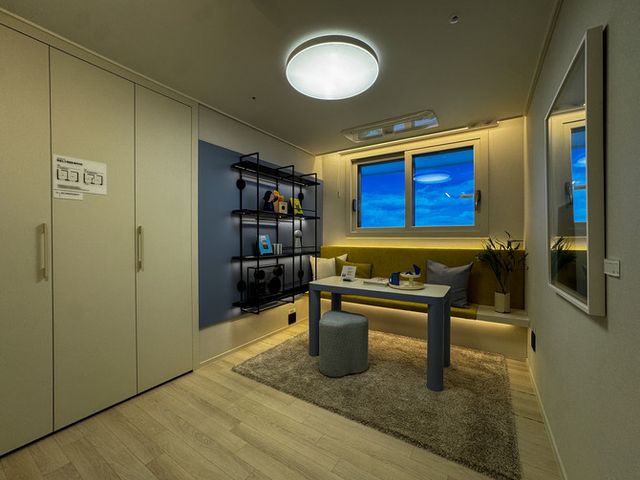 실내에 들어서면 시선을 사로잡는 탁 트인 거실이 보인다. 천장고는 2300㎜, 우물천장은 2400㎜로 넓은 공간감을 제공했다. 거실과 맞닿은 '침실1'에는 드레스룸이 배치됐으며, 침실2·3에도 매립형 붙박이장을 기본 제공해 수납 효율을 높였다.