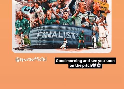 손흥민은 9일(현지시간) 자신의 사회관계망서비스(SNS)에 2024-2025 유로파리그 결승 진출 기념 포스터를 공유하면서 "좋은 아침입니다. 조만간 피치에서 만나요"라는 글을 남겼다.