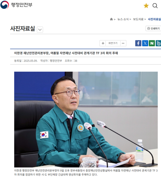 행정안전부는 9일 이한경 재난안전관리본부장 주재로 '여름철 자연재난(태풍·호우) 사전대비 점검 TF' 3차 회의를 개최, 여름철 하천 범람에 대비해 기관별 안전관리 대책을 점검했다.