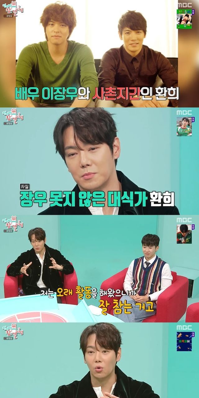 환희는 "저 되게 잘 먹는다. 먹는 거 되게 좋아하는 집안이다"며 "오래 활동을 해왔으니까 (식욕을) 참는 것"이라고 설명했다. 이어 그는 "장우 씨는 놓은 거다"고 덧붙이자 전현무는 "완전히 놨다"며 공감했다.