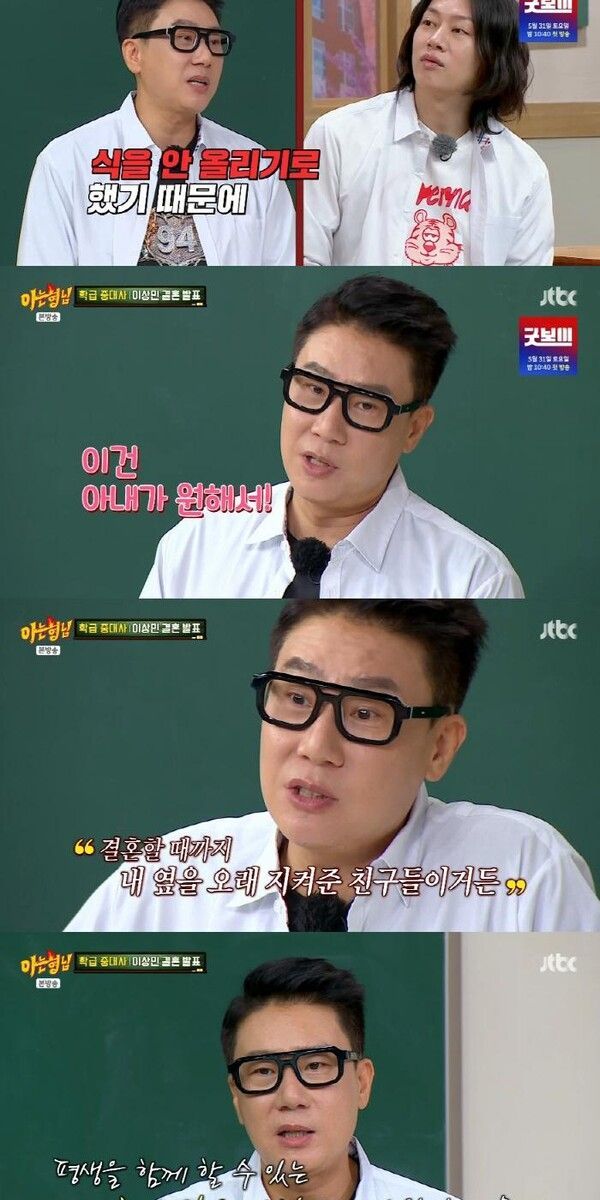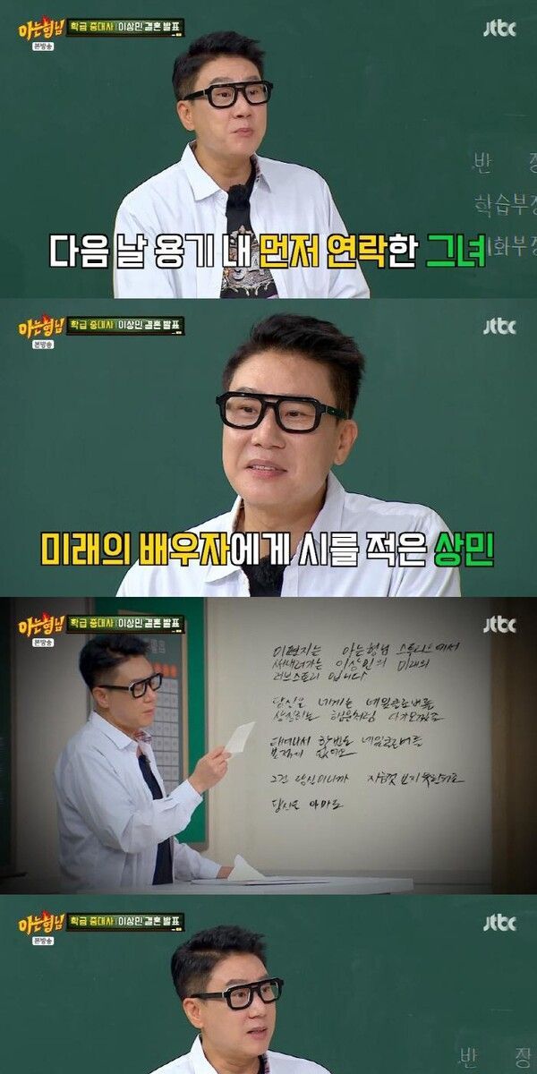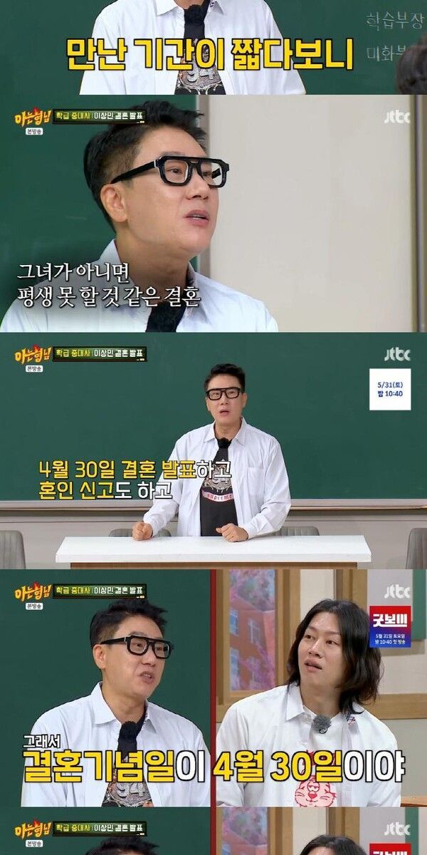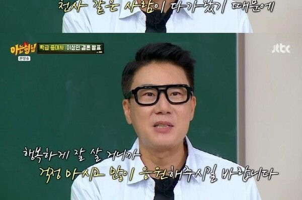 지난 10일 방송된 JTBC '아는 형님'에서는 이상민의 재혼 소식이 전해지자 멤버들이 "몰래카메라인 줄 알았다", "가짜 뉴스인 줄 알았다"며 놀라움을 금치 못했다. 이때 김희철이 이상민의 SNS 손편지를 읽어 내려가자 이수근은 "주접이다"고 해 웃음을 안겼다. 민경훈이 자신의 결혼식에서 이상민이 부케를 받았다며 결혼의 시작점이 된 것 같다고 말했고, 서장훈은 김희철이 놓쳐서 이상민이 받게 됐다는 비하인드를 전해 폭소를 자아냈다.