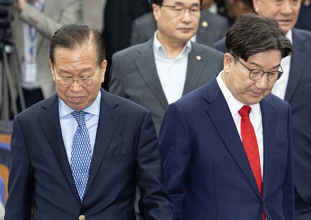 권영세 국민의힘 비상대책위원장과 권성동 원내대표가 8일 오후 서울 여의도 국회에서 열린 의원총회에 참석하고 있다. / 뉴스1
