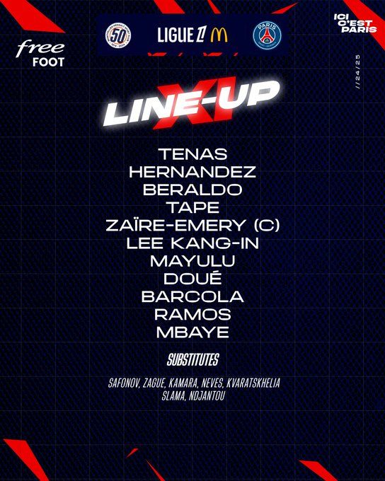 PSG는 4-3-3 포메이션을 들고 나왔다. 시즌 첫 선발로 출전한 아르나우 테나스가 골문을 지켰고, 수비진은 좌우에 악셀 타페와 워렌 자이르-에메리가 배치됐으며, 센터백에는 뤼카 에르난데스와 루카스 베랄두가 짝을 이뤘다. 미드필드는 이강인, 세니 마율루, 데지레 두에로 구성했고, 공격진에는 브래들리 바르콜라, 곤살로 하무스, 이브라힘 음바예가 나섰다. 이날 출전한 11명은 PSG 역사상 가장 어린 평균 연령의 선발 라인업이었다.