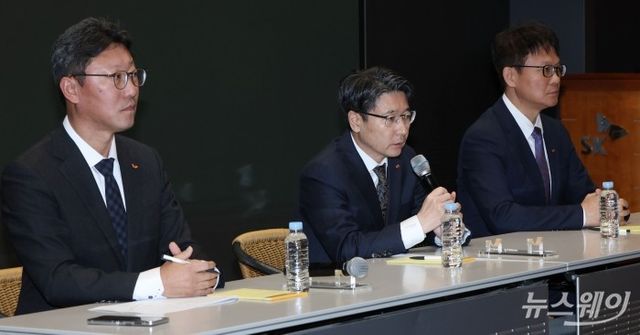(왼쪽부터) 류정환 SKT 네트워크 인프라 센터장, 임봉호 SKT MNO 사업부장, 김희섭 SKT 커뮤니케이션 센터장이 7일 오전 서울 중구 SK텔레콤 T타워 SUPEX홀에서 SK텔레콤의 해킹 사고와 관련해 취재진 질문에 답하고 있다. 2025.05.07. 사진=강민석 기자 kms@newsway.co.kr