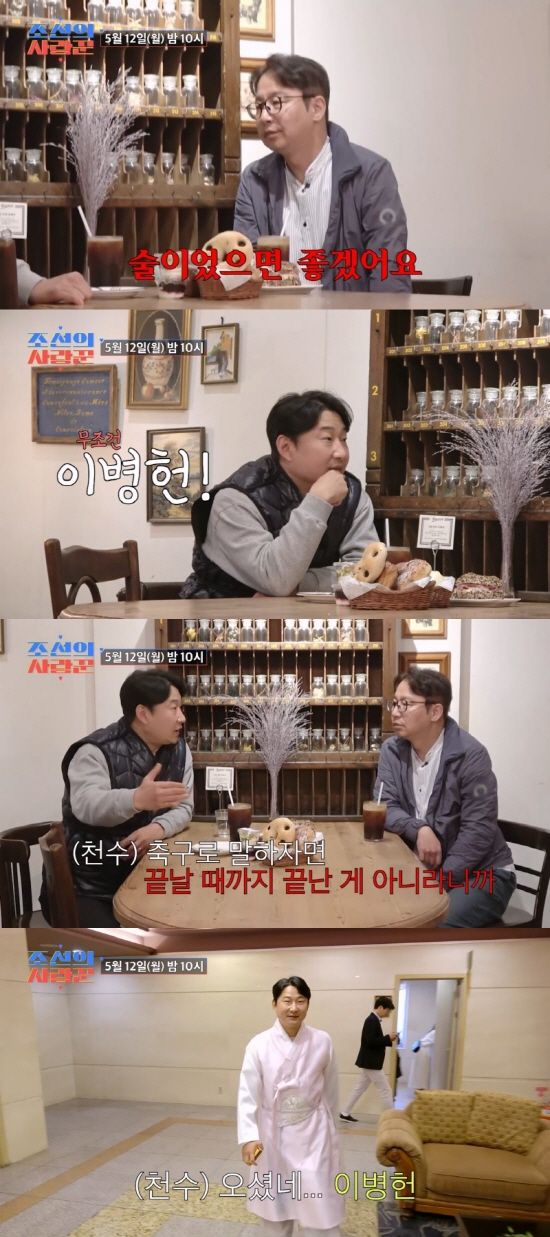 심현섭이 불안에 떨자, 이천수는 "이병헌!"이라며 자신 있게 대답했다. 그는 프로 승부사의 기질(?)을 소환하며 "아직 일주일 남았으니까, 축구로 말하자면 끝날 때까지 끝난 게 아니다"라며 "전반 끝났다. 후반 30분 남았다. (제가) 닥치면 하는 사람이다"라고 심현섭을 안심시켰다.