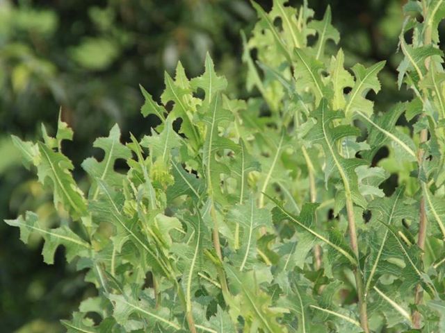 잎은 어긋나기 형태다. 잎자루가 없다. 긴 타원형 또는 피침형으로 길이 10~20cm, 폭 2~7cm다. 잎 끝은 뾰족하고, 기부는 줄기를 감싼다. 가장자리는 깃 모양으로 갈라지거나 거치가 있다. 특징적으로 잎 뒷면 주맥과 가장자리에 날카로운 가시가 줄지어 있다. 이 가시는 식물의 이름 유래이기도 하다. ‘serriola’는 라틴어로 ‘작은 톱’을 뜻한다. 잎과 줄기의 가시가 톱니처럼 생긴 데서 비롯됐다. 줄기나 잎을 자르면 흰 유액이 흐른다. 이 유액은 쓴맛을 낸다.