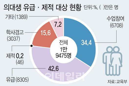 교육부는 “1학기 수업에 참여할 수 있는 대상은 의대생의 34.4%인 6708명”이라며 “성적 경고 예상자와 1과목 수강자 중 예과생은 2학기에 수업 참여가 가능하며, 1학기 미이수 학점을 보충하면 정상 진급도 가능하다”고 했다.