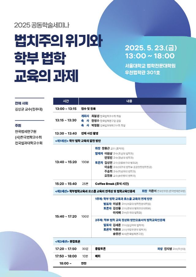 (사)한국법학교수회는 오는 23일 서울대학교 우천법학관에서 ‘새로운 정부에 바라는 법학 교육 정책’이라는 주제로 공동학술대회를 개최한다고 11일 밝혔다. 이번 학술대회는 한국법제연구원과 전국법과대학교수회 등과 공동으로 참여한다.