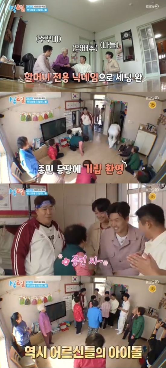 딘딘은 "종민이 형이 오니까 다들 일어나신다"며 다시 한 번 어르신들의 아이돌인 김종민의 면모에 놀라워했다.