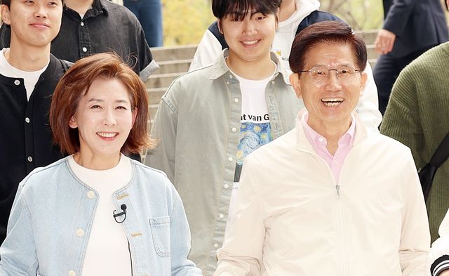김문수 전 고용노동부 장관(현 국민의힘 대선 후보)과 나경원 국민의힘 의원이 지난달 12일 서울 동작구 중앙대학교 한 패스트푸드점에서 대학생들과 간담회를 갖기 위해 이동하고 있다. 자료 사진 / 뉴스1