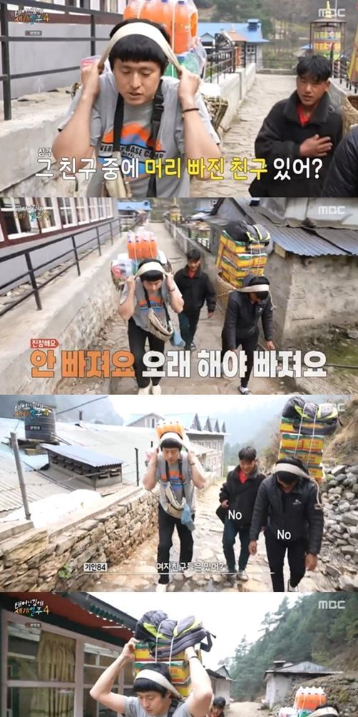30kg에 달하는 무거운 짐 탓에 연신 힘들어하는 모습을 보인 기안84는 "이거 탈모 안 오나? 이거 많이 들면 머리 안 빠져? 친구 중에 머리 빠진 친구 있어?"라고 묻자, MZ 셰르파는 "안 빠져요. 오래 해야 빠져요"라고 전했다.