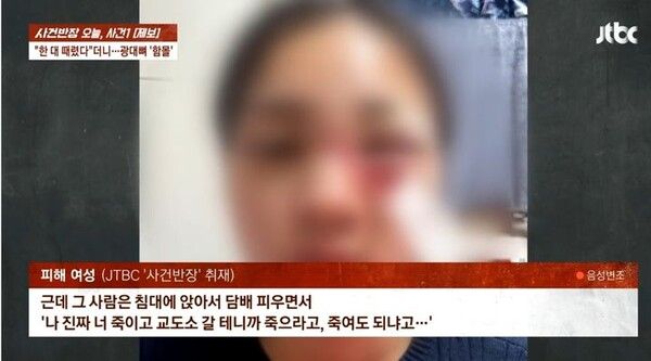 방 안 침대에 걸터앉아 담배를 피우던 남성은 무릎을 꿇은 채 울고 있는 A씨를 향해 "너 죽이고 교도소 갈 테니까 죽어, 죽여도 되냐"고 협박했다.