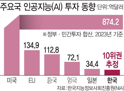 한국지능정보사회진흥원(NIA)의 ‘글로벌 AI 투자 동향’ 보고서에 따르면 2023년 미국의 AI 민관 투자 규모는 874억2000만 달러로 1위를 기록했으며, EU와 중국은 각각 134억9000만 달러, 112억8000만 달러를 투입했다. 한국은 공식 수치는 없지만 약 34억 달러를 투자한 일본·캐나다보다도 낮은 수준으로 전체 10위권에 그칠 것으로 추정된다. 대한상공회의소는 최근 전략 제언서를 통해 앞으로 3~4년이 AI 강국 도약의 골든타임이라며, 정부가 민간과 협력해 기술혁신과 시장창출에 적극 나서야 한다고 강조했다.