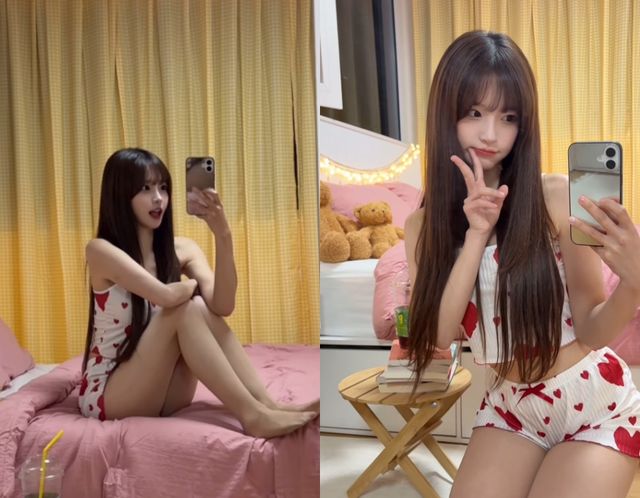 공개된 영상 속 박민정은 하트 패턴의 투피스 파자마를 입고 거울 셀카를 찍고 있다. 거울 앞에서 요염한 포즈를 취하고 있는 박민정은 이내 침대에 앉아 늘씬한 각선미까지 자랑해 시선을 강탈했다.