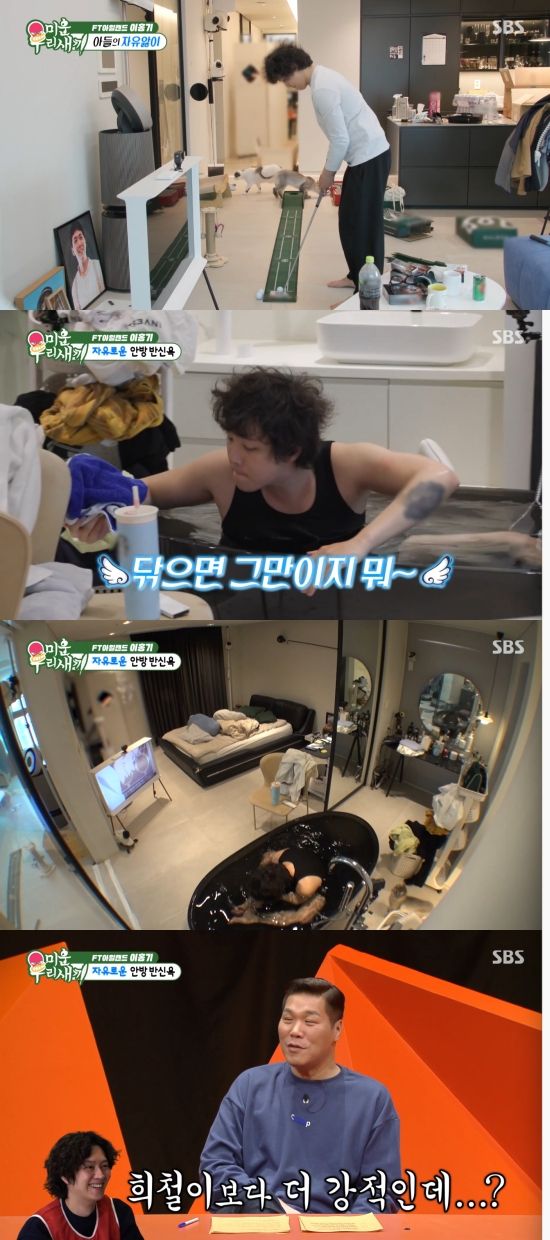 이후 욕조에 물을 받아 반신욕을 시작했고 물이 넘치면서 안방에는 물난리가 났다. 이홍기는 물이 넘치는 것에 아랑곳하지 않고 "어차피 청소할 거였다"며 대충 물기를 수건으로 닦았다.