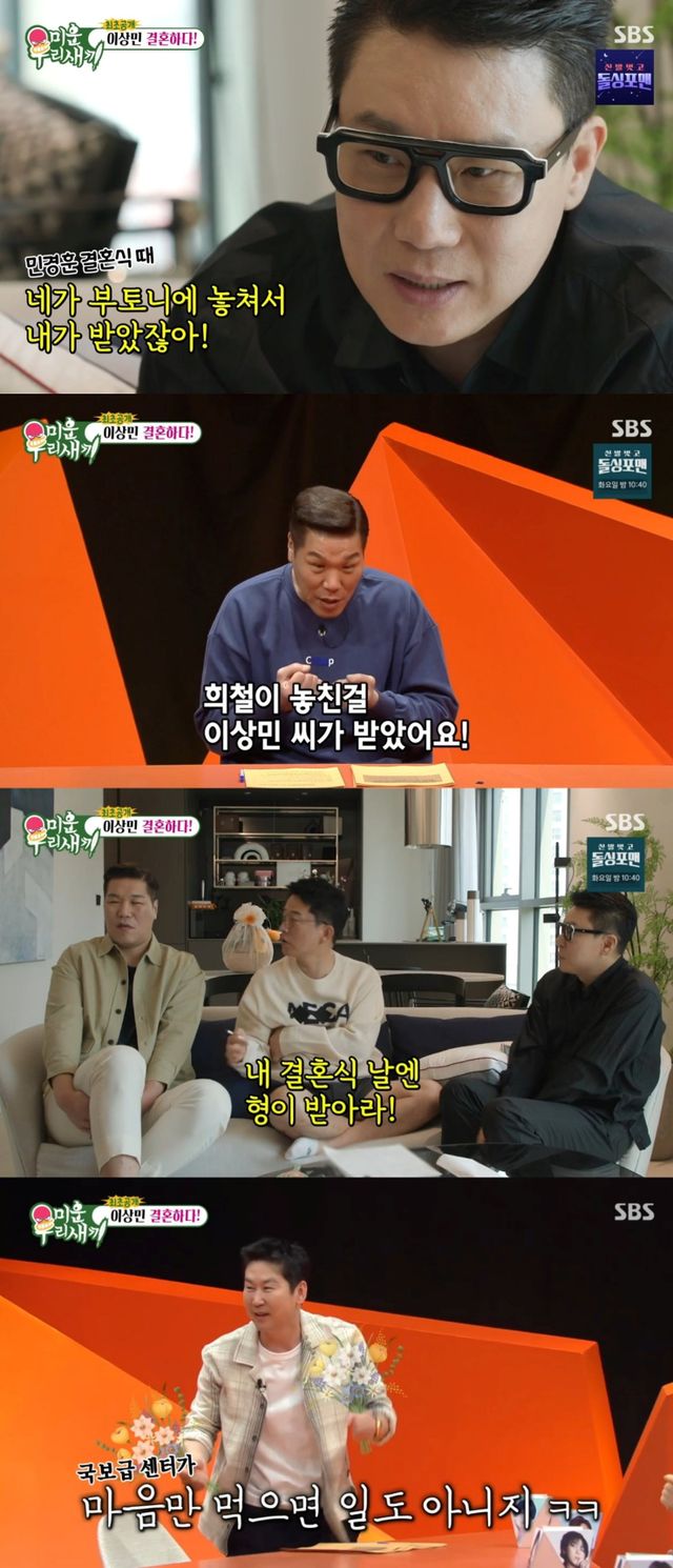 통화하던 중 이상민이 김희철에게 "더 웃긴 게 뭔지 아냐. 민경훈 결혼식 때 네가 받아야 될 부토니를 놓쳐서 내가 받았잖아"라고 말하자 잊어버리고 있었던 듯 김준호는 깜짝 놀랐고, 김희철 또한 "그거 때문에 결혼하나?"라고 말했다.