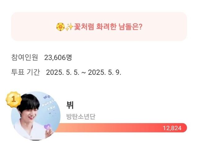 뷔는 K팝 아이돌 커뮤니티 최애돌이 5월 5일부터 9일까지 진행한 ‘꽃처럼 화려한 남자 아이돌’ 투표에서 1위를 차지했다.