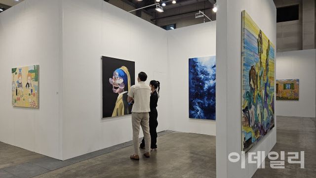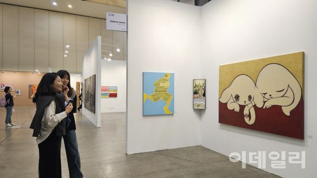 | ‘아트부산 2025’ 전경. 두 관람객이 갤러리조은 부스에 걸린 일본작가 마이코 코바야시의 ‘둘’(2022)을 바라보며 환하게 웃고 있다. 옆으로 회화작품을 설치작품처럼 내걸어 시선을 끈 이재현의 ‘당신의 동화가 여기 있습니다’(2025)와 백윤조의 ‘무임승차자’(2025)가 보인다(사진=오현주 문화전문기자). |