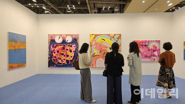 | ‘아트부산 2025’ 전경. 캐나다갤러리를 찾은 관람객들이 미국작가 캐서린 번하드의 작품들을 바라보고 있다. 안쪽 왼쪽부터 ‘크레이지 몬스터 드러기’(2024), ‘핑크 팬더+행운의 부적’(2023), ‘주시’(2025)가 보인다. 이 중 ‘주시’가 첫날 10만달러(약 1억 4000만원)에 팔렸다(사진=오현주 문화전문기자). |