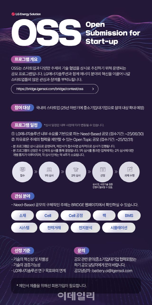 LG에너지솔루션은 전 세계 유망 스타트업과의 기술 협력을 강화하고, 미래 배터리 산업의 혁신을 주도하기 위해 ‘OSS(Open Submission for Start-up)’ 프로그램 운영을 시작했다고 12일 밝혔다.