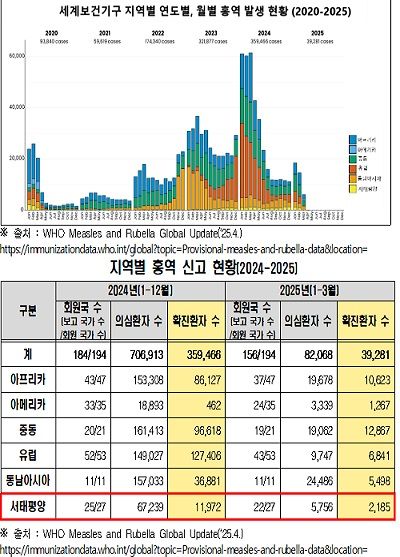 세계보건기구(WHO) 자료에 따르면, 2024년 한 해 동안 전 세계적으로 35만 9,466명의 홍역 확진자가 발생했다.