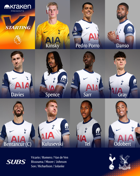 홈팀 토트넘은 4-3-3 전형으로 나섰다. 안토닌 킨스키 골키퍼가 지난 2월 이후 석 달 만에 선발 출장했고 제드 스펜스- 벤 데이비스, 케빈 단소, 페드로 포로가 수비를 구축했다. 중원은 아치 그레이, 파페 사르, 로드리고 벤탄쿠르가 지켰다. 측면에 마티스 텔과 윌송 오도베르, 중앙에 데얀 쿨루셉스키가 출격했다.