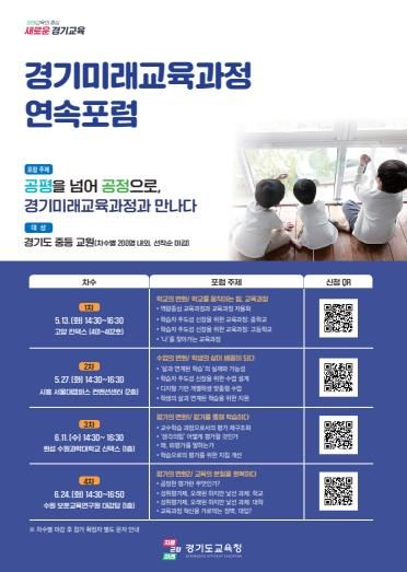 포럼은 5월(13일, 27일)과 6월(11일, 24일)에 총 4차로 운영한다. 그동안 이뤄진 경기미래교육과정 논의를 정리하고 학교 현장의 실천 방향 모색 및 미래교육을 위한 교육과정의 정책 방향을 집중 탐색할 계획이다.