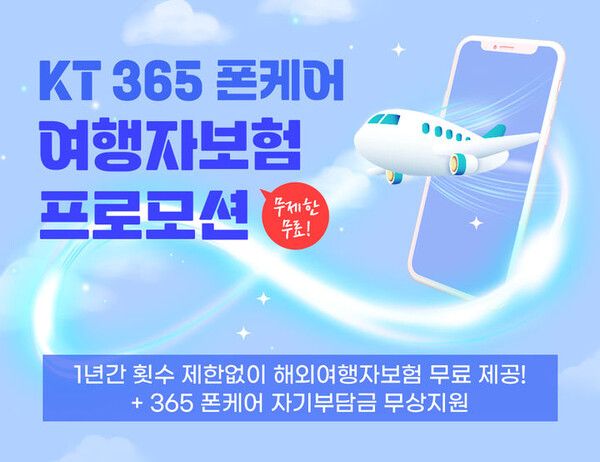 뉴시스 보도에 따르면, 8월 31일까지 진행되는 이번 프로모션은 KT 휴대폰 보험 서비스인 365 폰케어 신규 가입 고객이 대상이다. 가입일로부터 1년간 해외여행자 보험 무료 이용 혜택과 해외 단말기 사고 발생시 자기부담금 면제 혜택을 제공한다.
