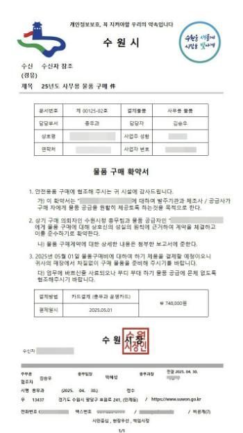 [와이뉴스] 수원시에서 컴퓨터 판매업체를 운영하는 A씨는 지난 4월 30일, “수원시 소속 주무관”이라고 신분을 밝힌 B씨의 전화를 받았다. B씨는 사무용 물품 견적을 요청하며 통화를 마친 후에는 수원시 명의로 작성된 ‘물품구매 확약서’ 형식 공문을 보냈다. 가짜 공문이었다.